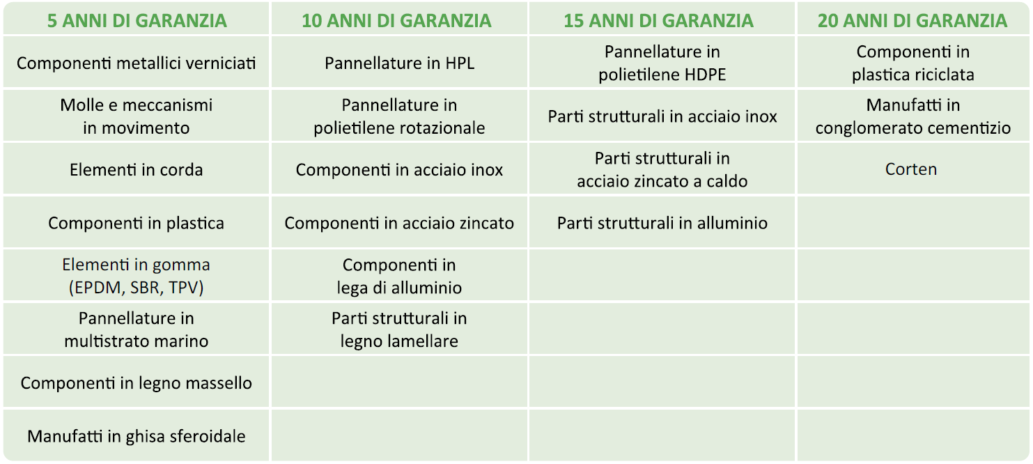 ESCLUSIONI DI GARANZIA: la garanzia non copre eventuali danni causati da incidenti, cura impropria, negligenza, normale usura, scolorimento o variazioni cromatiche, danni causati da atti vandalici e mancanza di manutenzione ordinaria. I naturali cambiamenti cromatici e/o di fessurazione del